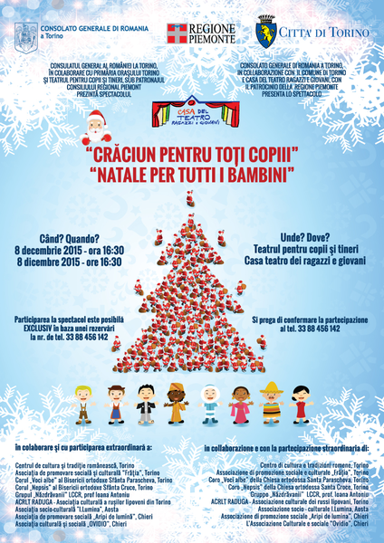 Le Consulat Général de Roumanie à Torino en collaboration avec la Ville de Torino, la Région Piémont et la Casa del Teatro Ragazzi e Giovani, a organisé le 8 décembre un spectacle de Noël pour offrir un après-midi de joie aux enfants de toutes les cultures. L'événement a eu lieu grâce aussi à la participation de nombreuses associations italo-roumaines locales.
